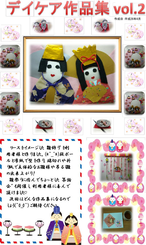 各曜日の利用者様が作りました。皆で協力し制作に取り組んだ作品や個人作品と様々です。これからの作品紹介をお楽しみに~